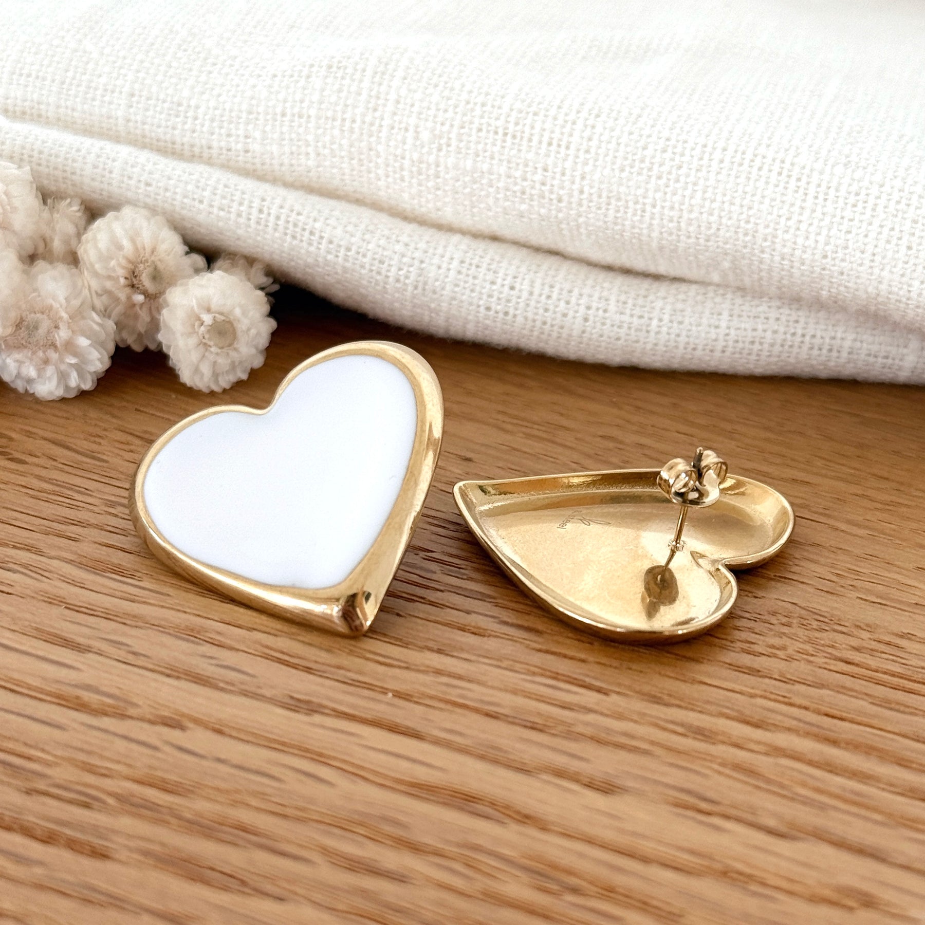 - Boucles d'oreilles motif gros cœur blanc et doré