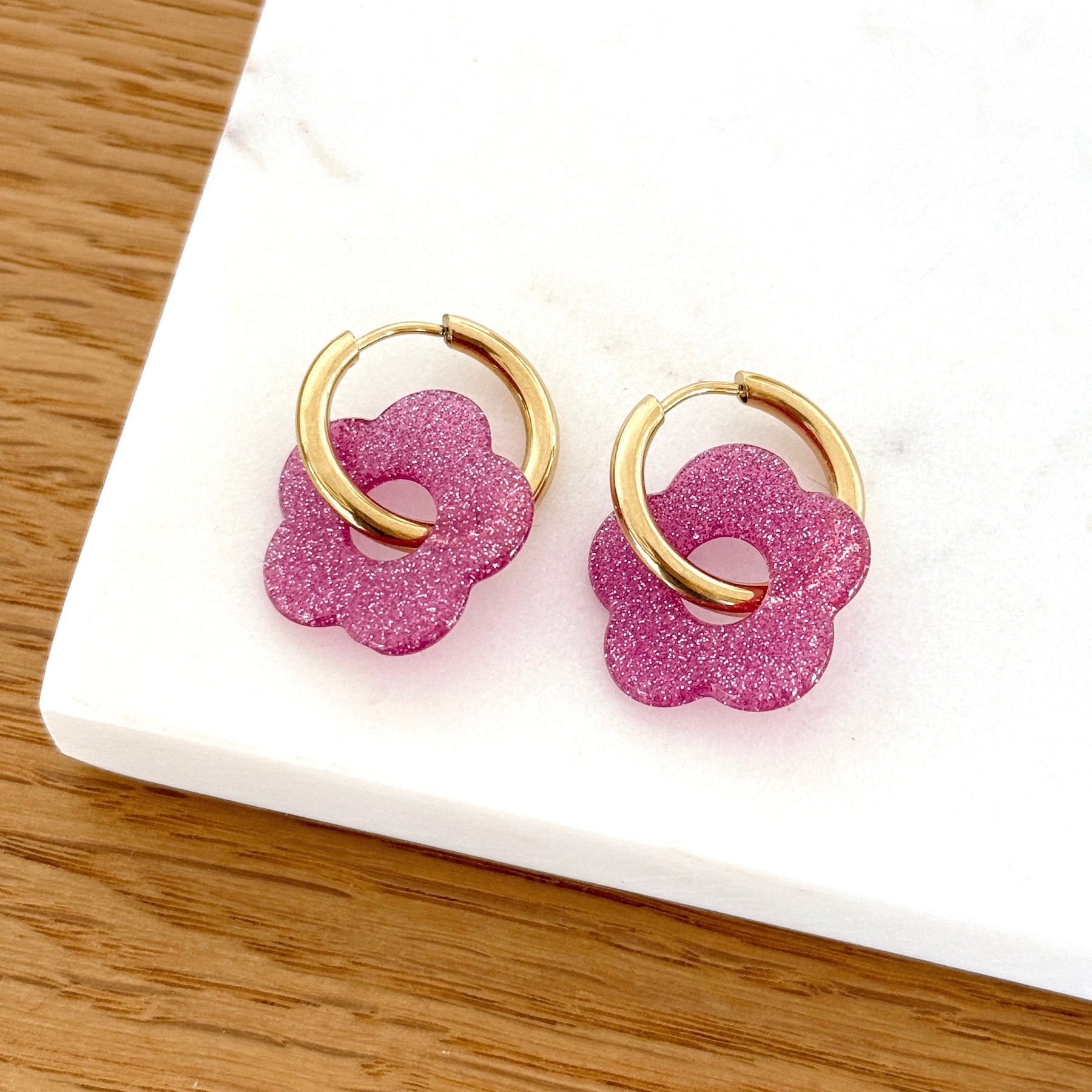 - Boucles d'oreilles composées d'un anneau fin orné d'une fleur en résine couleur rose pailleté