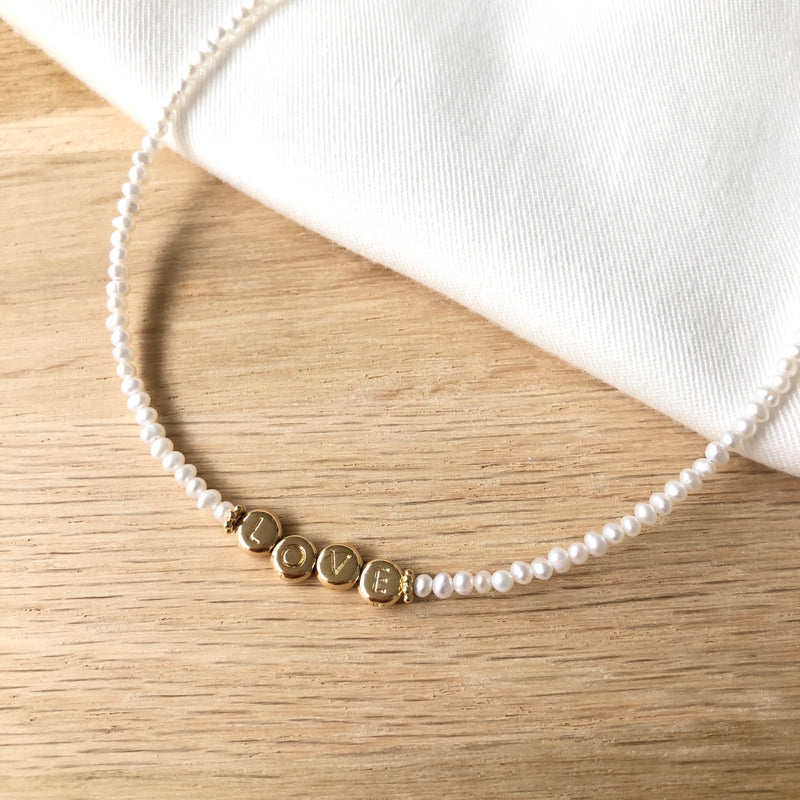 de su elección, pequeñas perlas de agua dulce (2 mm) y pequeñas flores doradas. - Ajustable de 38 a 42 cm.