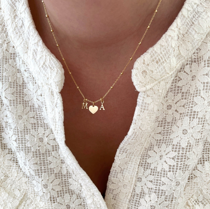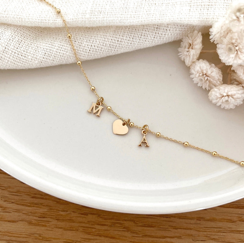 - Cadena fina con pequeñas bolitas compuesta por uno o varios colgantes con letras y corazonesa elegir (5 mm).