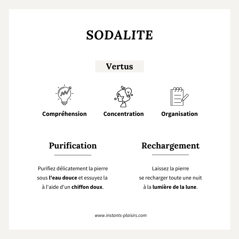 COMPRENSIÓN: La sodalita es una piedra que fomenta la confianza en uno mismo y en los demás. Esta piedra azul es conocida por mejorar la concentración y aclarar la mente. En el ámbito laboral, es ideal para organizar los pensamientos y la lógica.