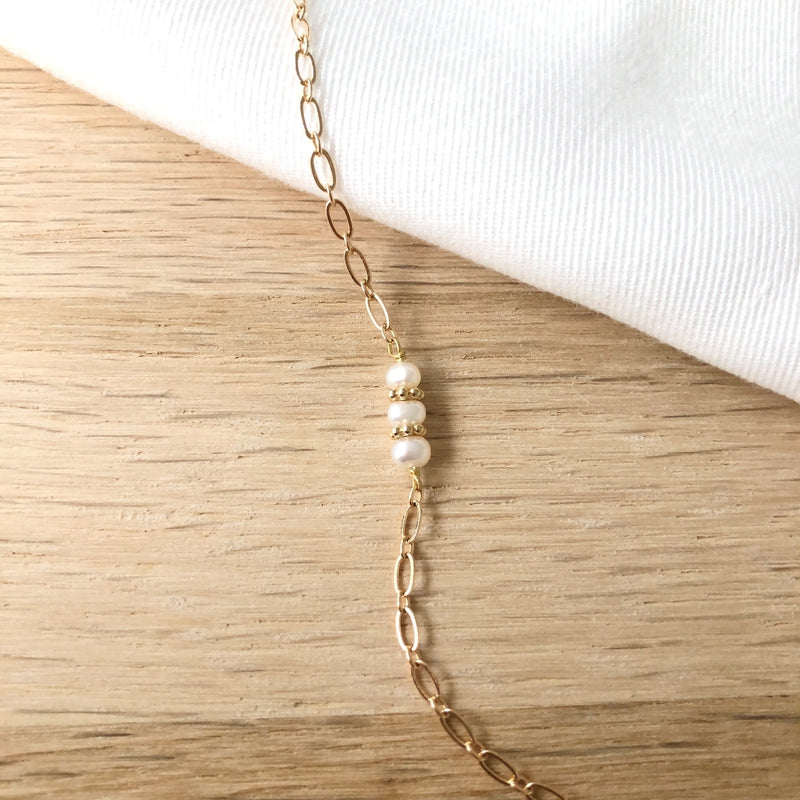 - Compuesto por perlas de agua dulce, pequeñas flores y una cadena con eslabones ovalados pequeños.
