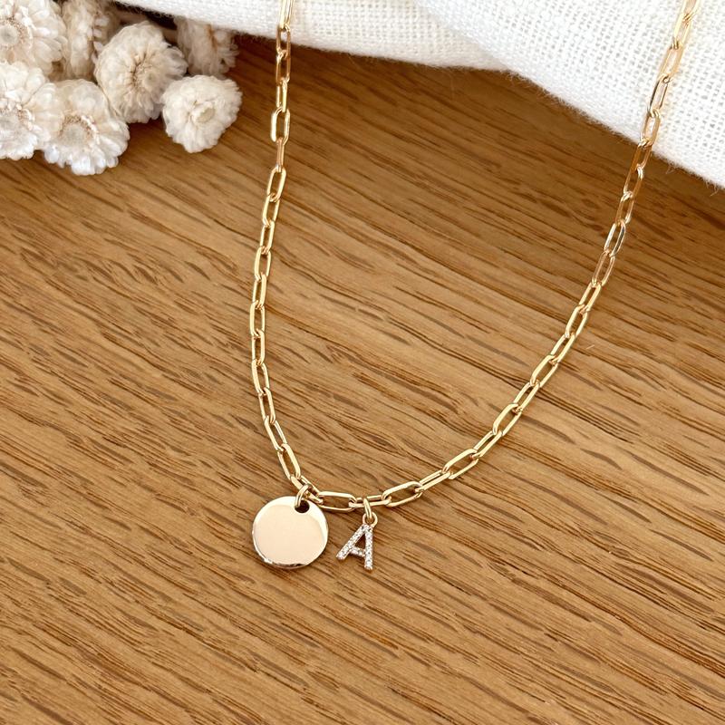 - Catena con maglie rettangolari composta da una medaglia bombata (10 mm) e una lettera incastonata con ossidi di zirconio (5 mm)