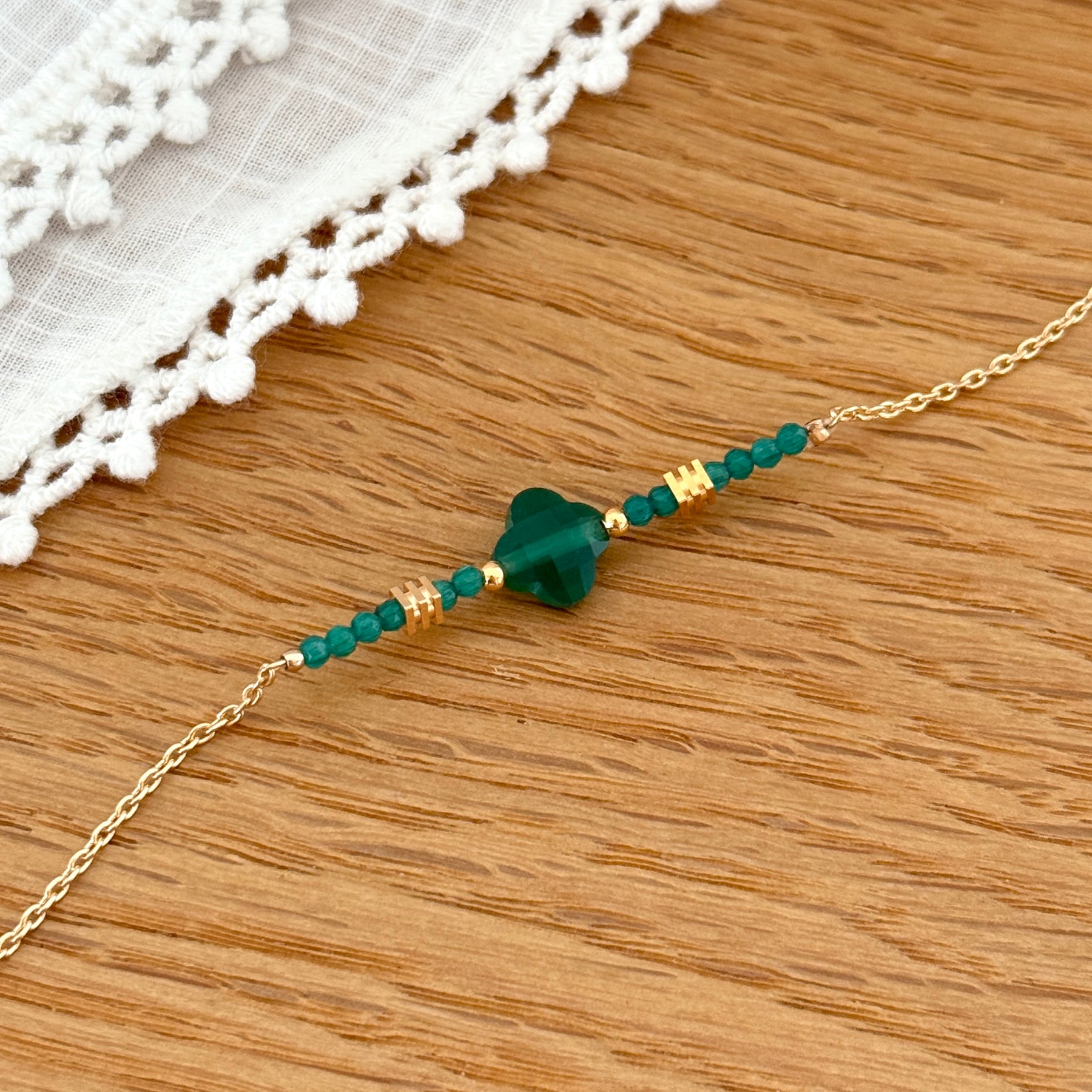 - Bracelet fin doré avec perles vertes et pendentif central au motif trèfle bombé vert