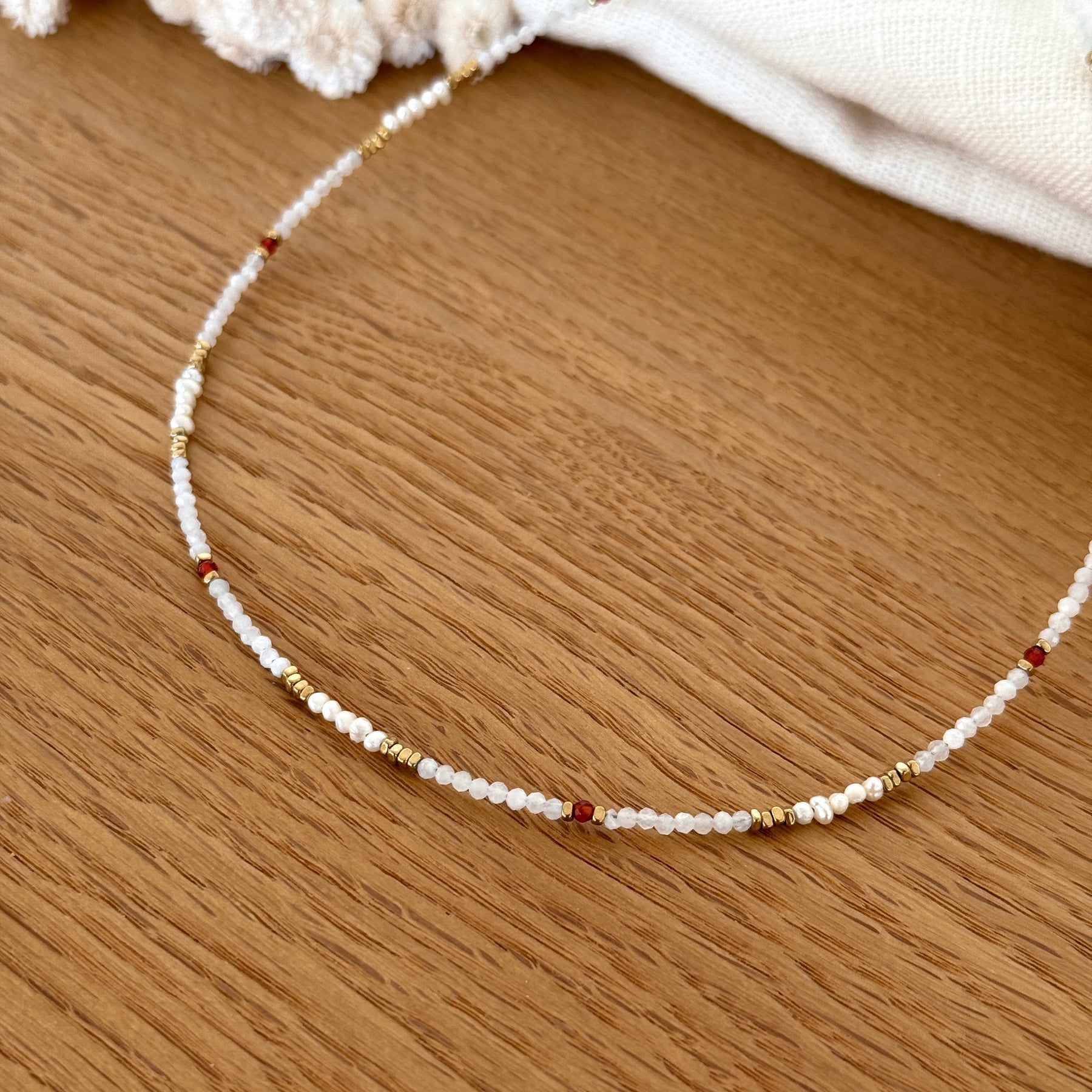 - Composé de pierres agate blanches et orange, de perles dorées et de perles d'eau douce