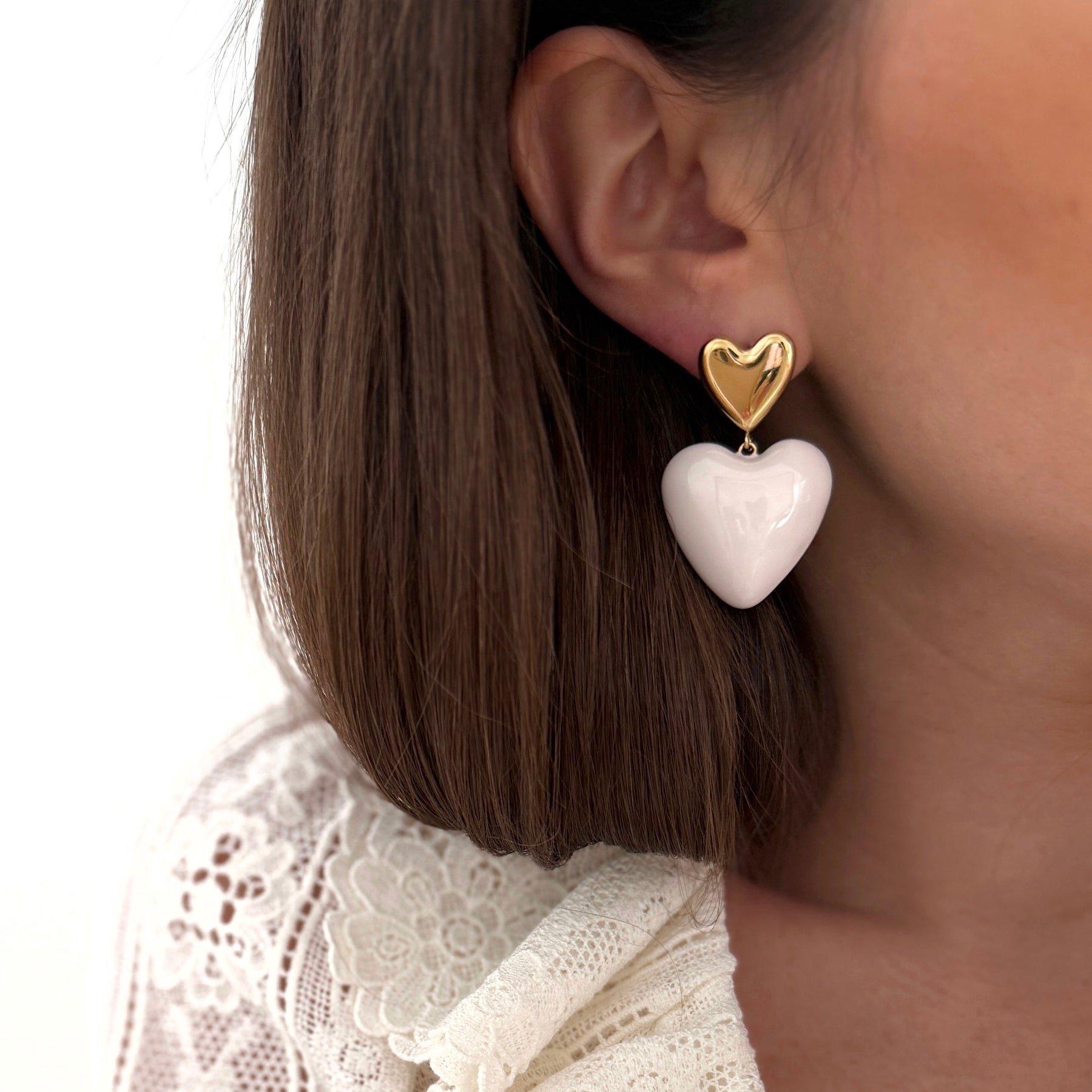 - Boucles pendantes composées de deux cœurs : un doré et un en résine écru