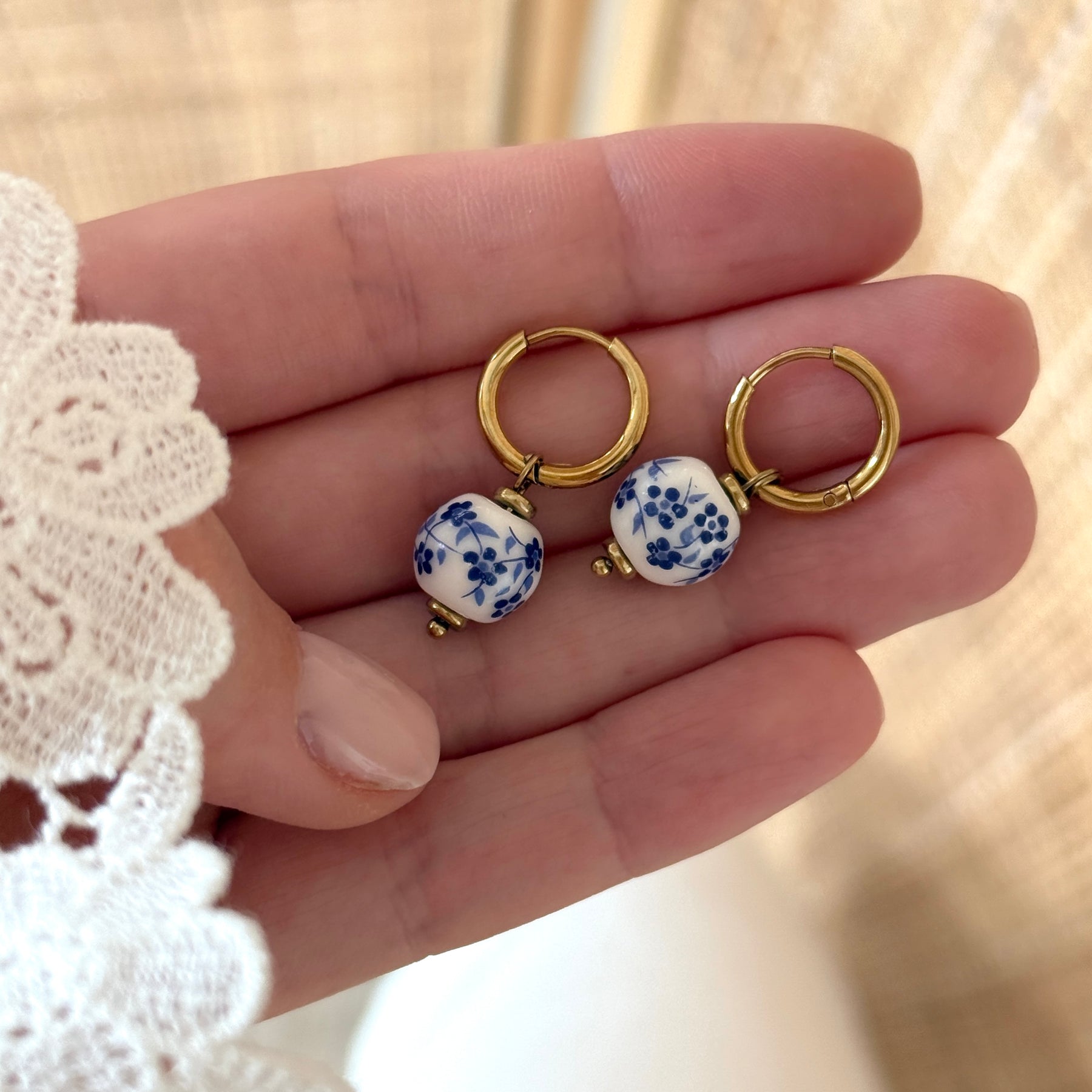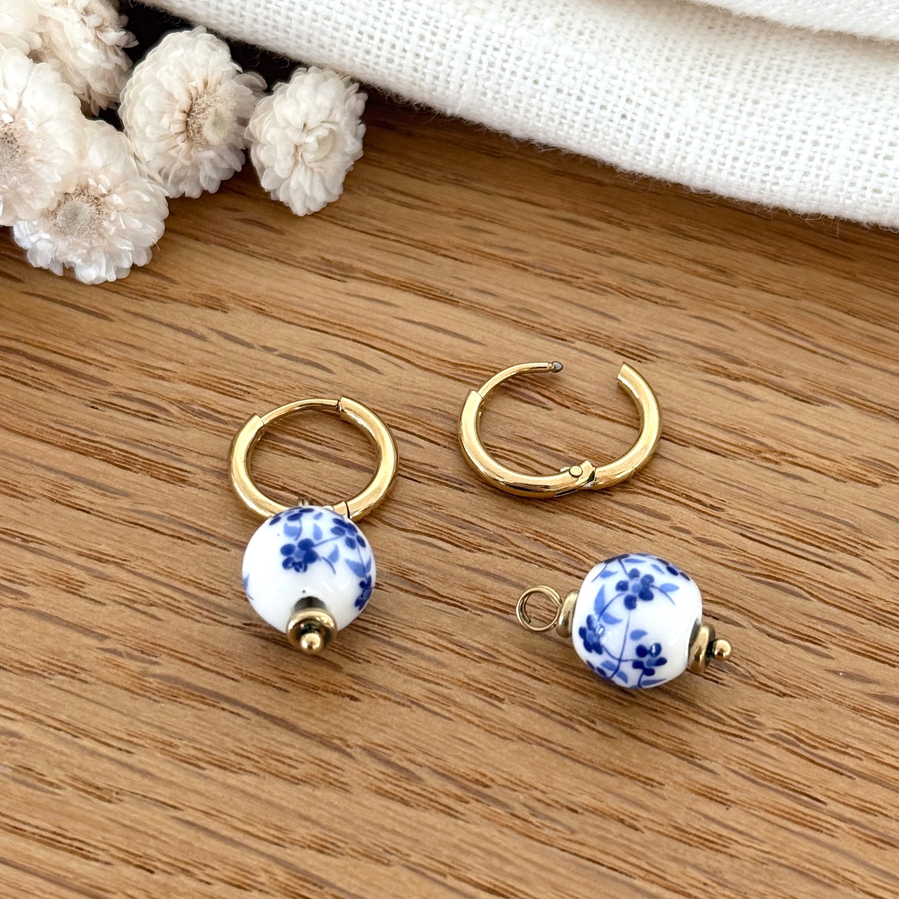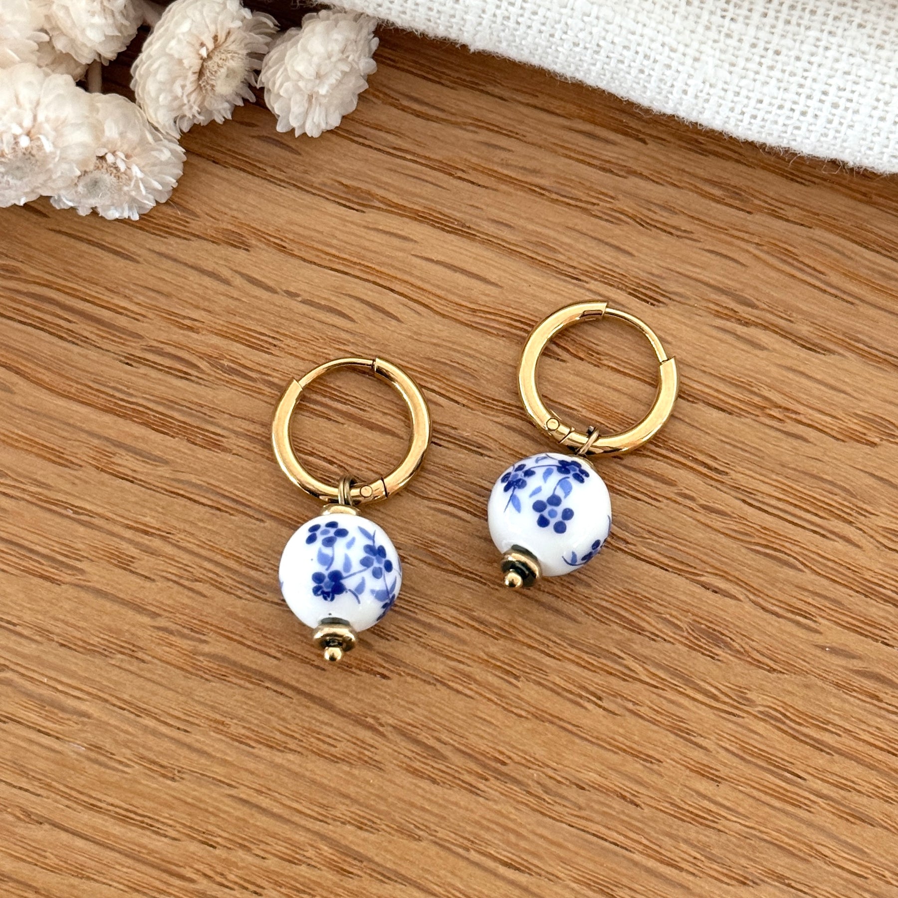 - Boucles d'oreilles composées d'une perle ronde en céramique à motifs fleurs bleues